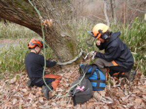 作業現場では、先輩作業員が後輩にロープワークの技術指導を行っていました。樹木の伐採には高度な技術と経験が必要で、特にロープを使った安全な作業手順は、現場の実践を通じてしか身につかない技術です。