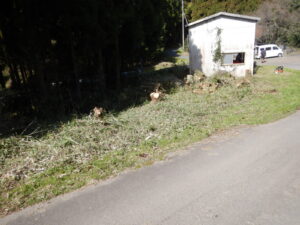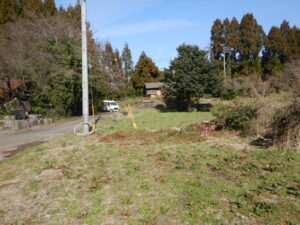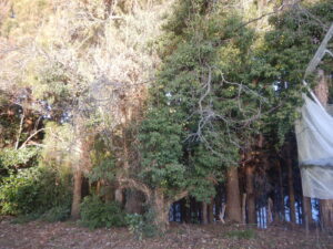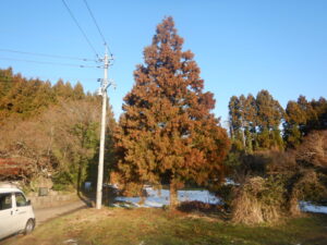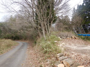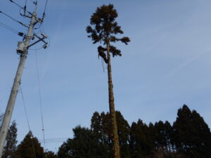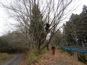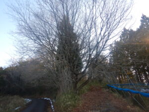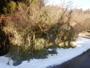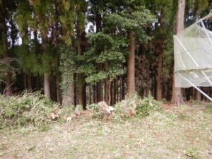 西伯郡南部町朝金地内の梨園入口にあった杉の木・コナラなどの樹木を伐採しましたのでご紹介。