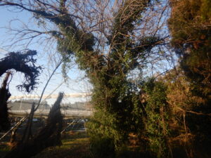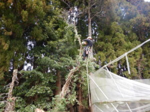 成長した樹木の枝が梨園の大切な防虫網に接触してしまい、網を傷める恐れがあるとの事で、梨の栽培において防虫網は欠かせない設備です。