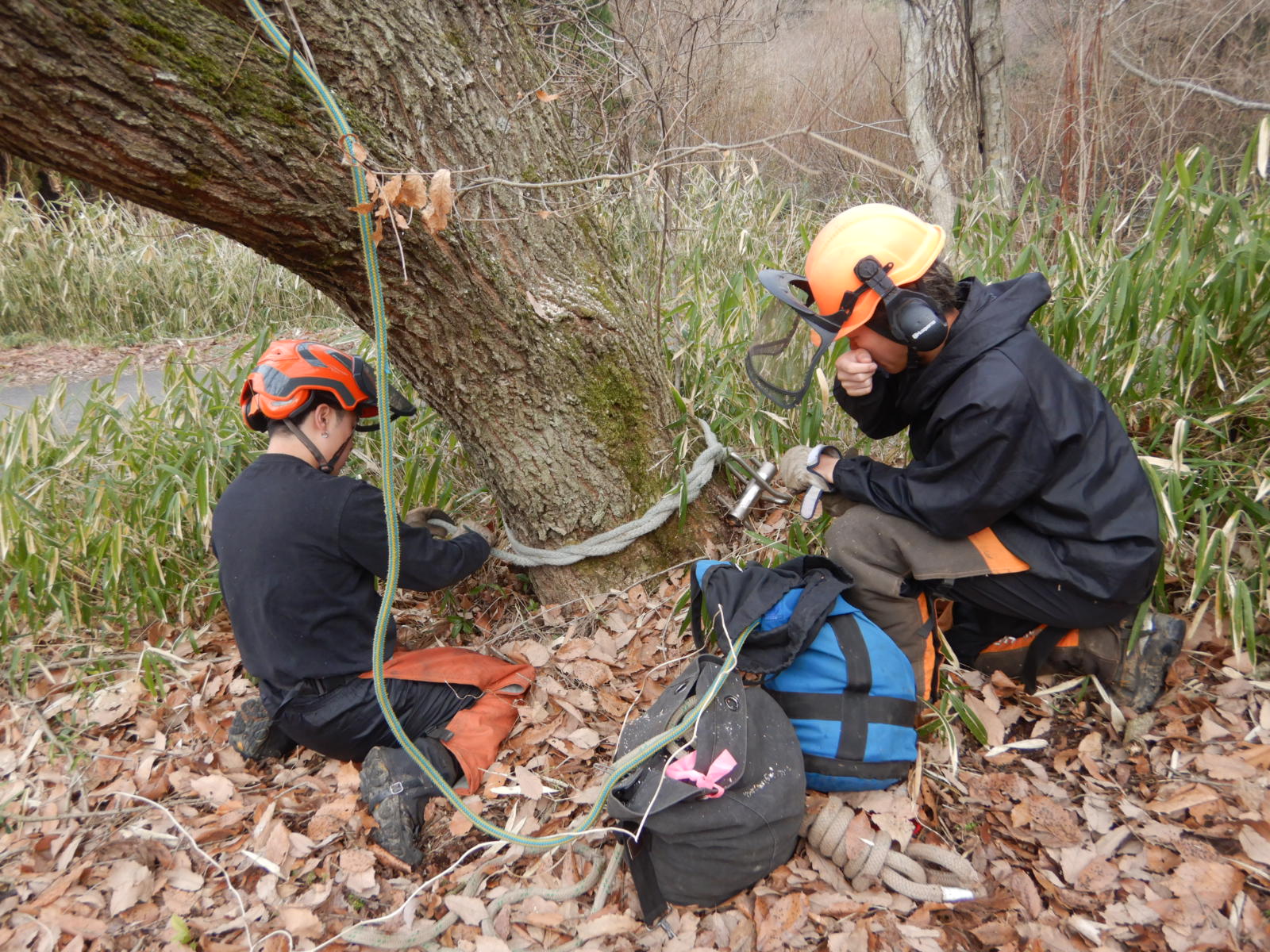 作業現場では、先輩作業員が後輩にロープワークの技術指導を行っていました。樹木の伐採には高度な技術と経験が必要で、特にロープを使った安全な作業手順は、現場の実践を通じてしか身につかない技術です。