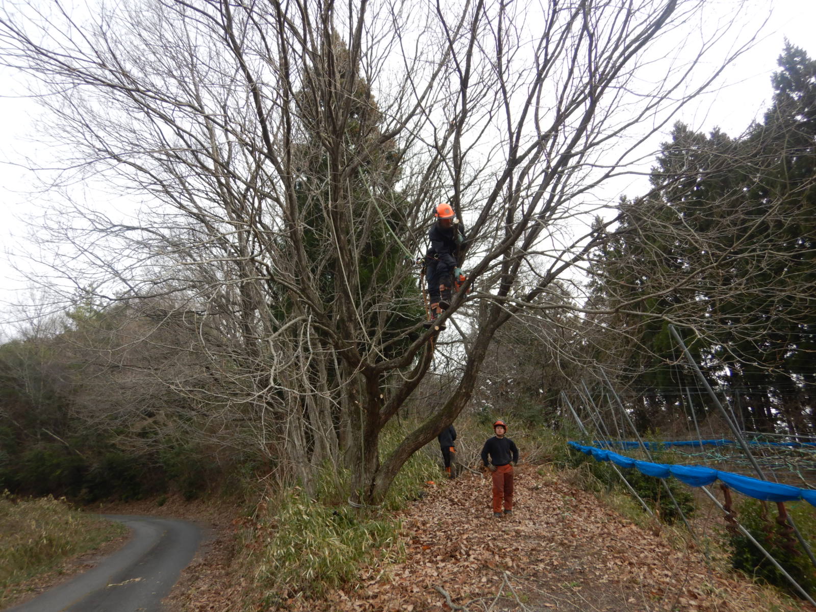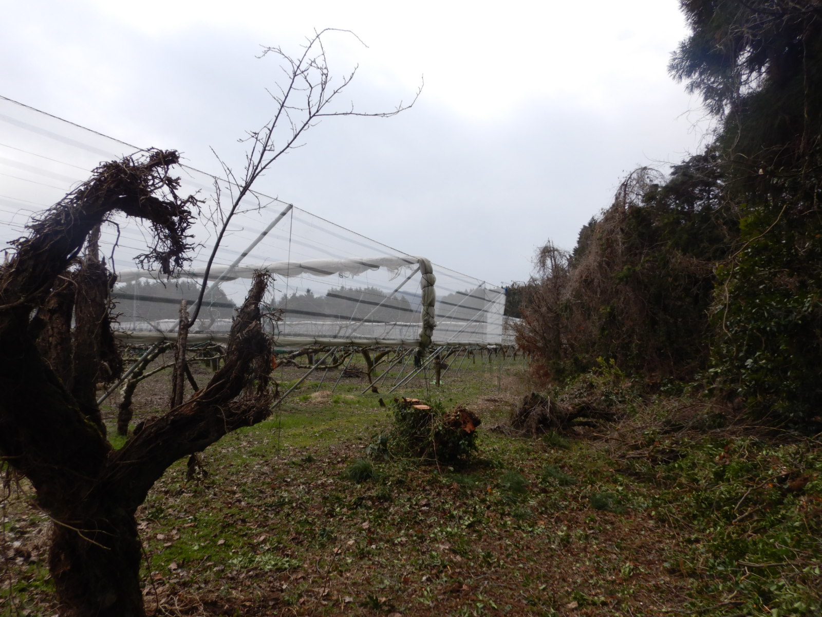 成長した樹木の枝が梨園の大切な防虫網に接触してしまい、網を傷める恐れがあるとの事で、梨の栽培において防虫網は欠かせない設備です。