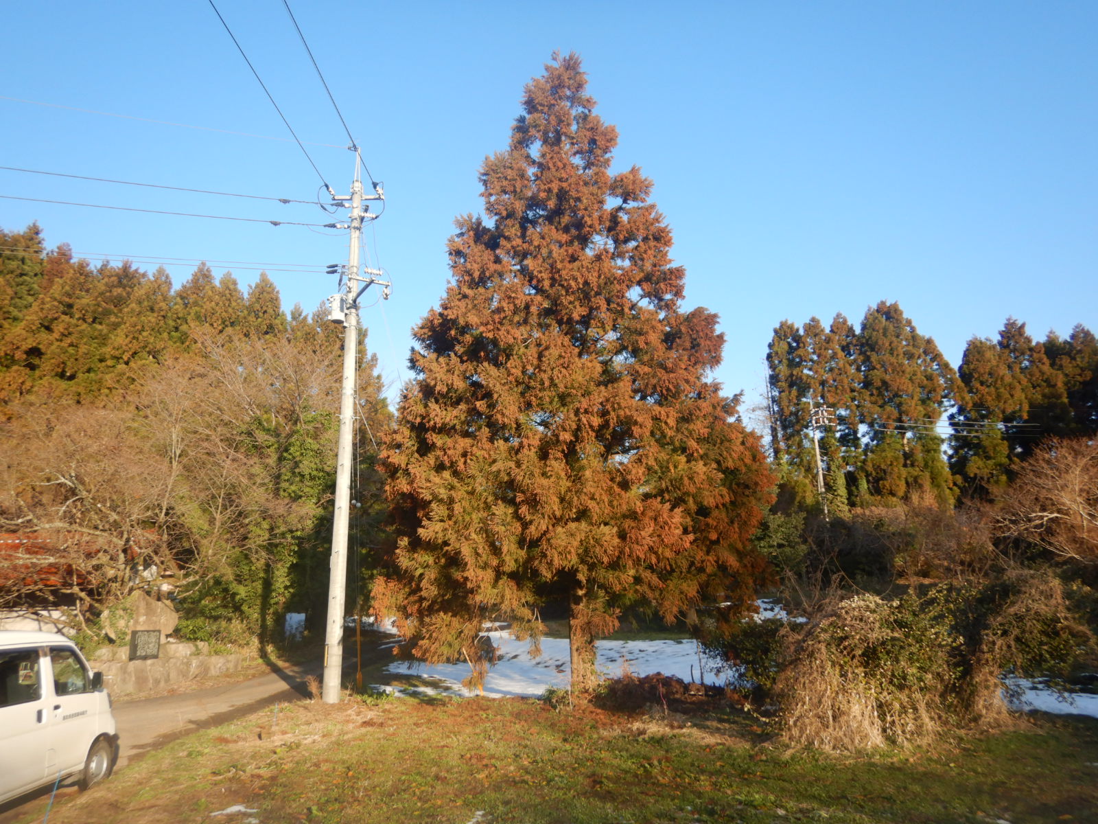 西伯郡南部町朝金地内の梨園入口にあった杉の木・コナラなどの樹木を伐採しましたのでご紹介。
