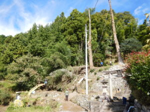 今回の現場は神社境内という特殊な環境のため、重機はミニグラップルしか使用できないという制約がありました。