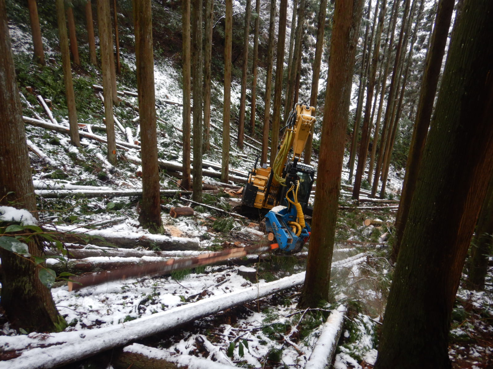 現場では、ハーベスターやフェラーバンチャーといった高性能林業機械も大活躍しています!